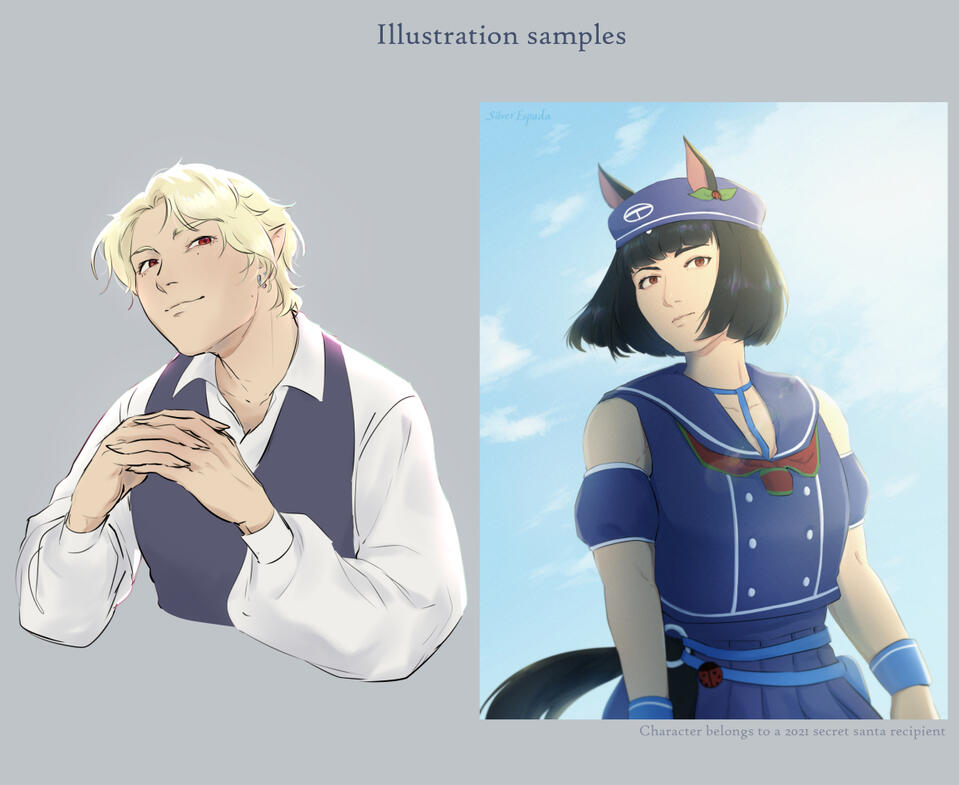 All commissioned artworks are for personal use only and not for commercial use.I maintain full copyrights of the commissioned artworks and the right to display them on my social media and/or my portfolio. The process of making the commission may be recorded as a timelapse video or live streamed through my Twitch channel.Commissioned artworks are digital only. No physical goods will be shipped.One commissioned artwork per slot. If you would like to commission multiple artworks, please fill out individual commission forms for each artwork.Do not remove my watermark.Do not take credit for my art. If you post the commission publicly, be sure to credit me @silverespadaCompleted commissions will be sent to the client through email first before it is posted on any social media.Violation of the terms will result in the client being banned from commissioning me again in the future.I will not draw any commission that contains: